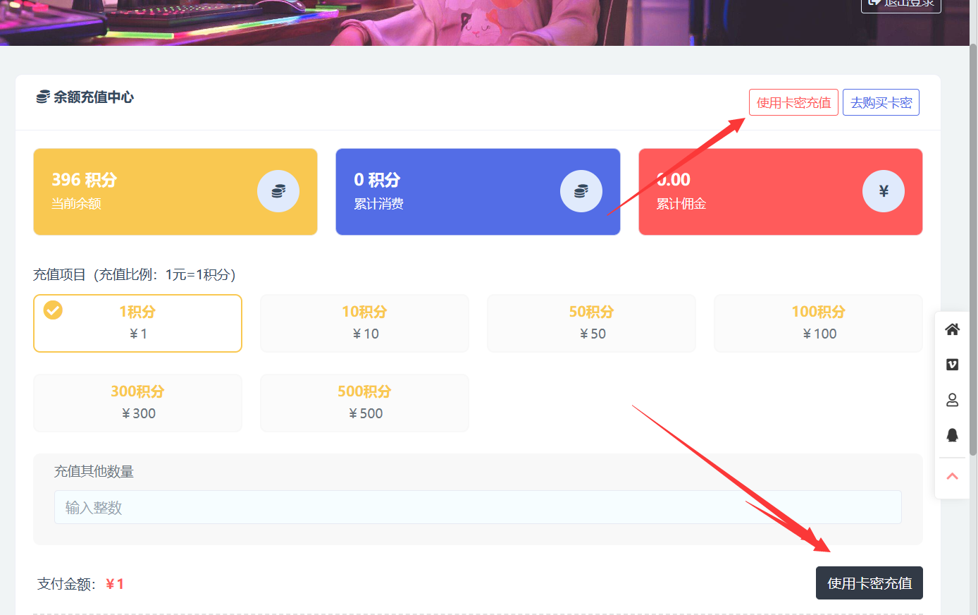 会员中心,充值余额,卡密充值,输入买到的卡密,